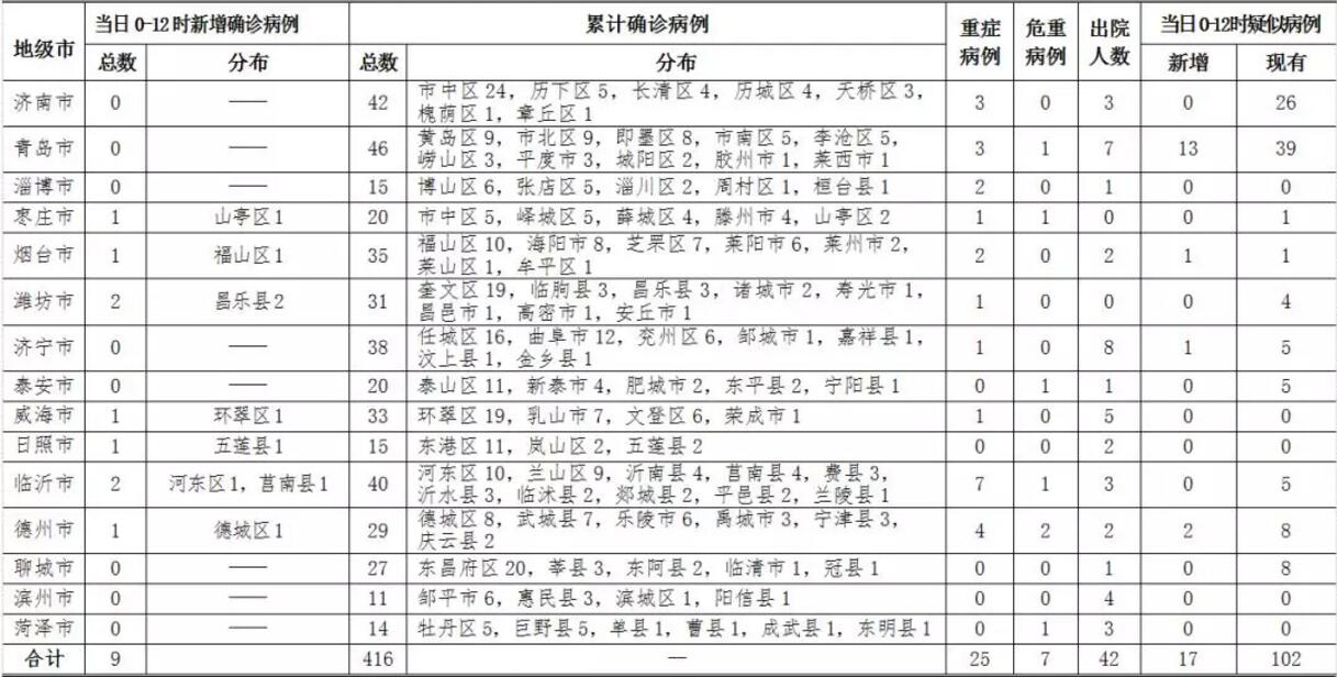 中新網(wǎng)2月8日電 據(jù)山東省衛(wèi)健委消息,2020年2月8日0-12時(shí),山東省報(bào)告新型冠狀病毒感染的肺炎新增確診病例9例,累計(jì)確診病例416例(含重癥病例25例,危重癥病例7例,出院42例,無死亡病例);新增疑似病例17例,現(xiàn)有疑似病例102例。截至目前,追蹤到密切接觸者12319人,已解除醫(yī)學(xué)觀察7139人,診斷為疑似或確診205例,尚有4975人正在接受醫(yī)學(xué)觀察。
