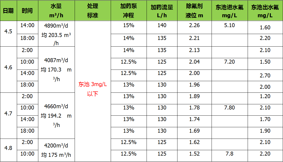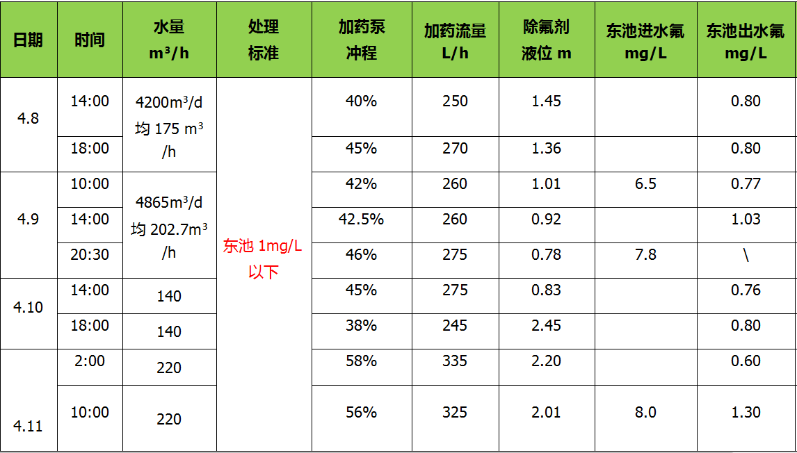 山東環(huán)瑞生態(tài)科技有限公司為多家企業(yè)解決了出水氟含量過高的問題,如山東某上市煤化工有限公司,按照客戶要求分別按照氟化物≦3mg/L或1mg/L進(jìn)行除氟,通過在東池(SBR處理后)和西池調(diào)整除氟劑投加量,將廢水氟化物降至客戶標(biāo)準(zhǔn)。
