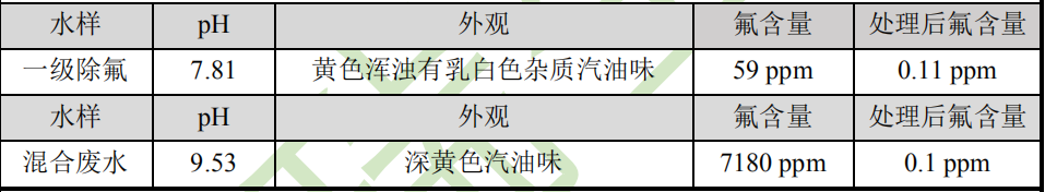 以下是一家化工廠,該廠的污水處理系統(tǒng)已經用了很多年,給其提供了高效除氟劑GMS-F4之后進行實驗,按貴公司當前的使用工藝和藥劑處理,高效除氟劑GMS-F4變量添加,其實驗結果如下: