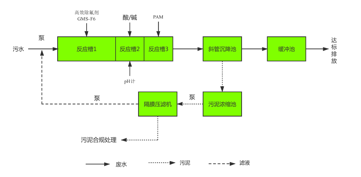 流程圖說明:此處理流程較為簡單,設(shè)定好一定條件即可將污水中氟化物降低到要求值以下。