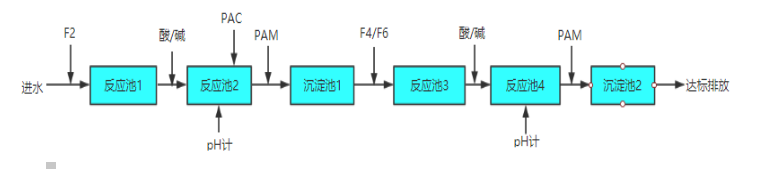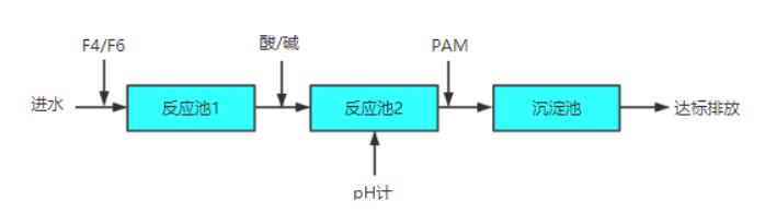 低濃度含氟廢水是指含氟在20mg/L左右,因這部分廢水已無法經(jīng)鈣鹽處理繼續(xù)降低,而通過吸附等方法又無法大規(guī)模運(yùn)行。針對(duì)這部分廢水可使用我公司液體除氟劑GMS-F4或固體除氟劑GMS-F6,一步處理,直接達(dá)標(biāo)排放,具體流程如下: