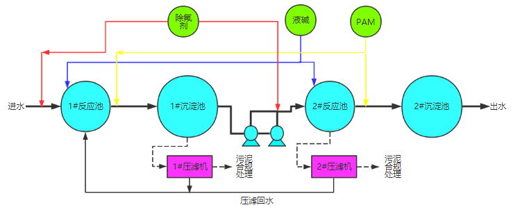 本項目廢水為煤制氣后產(chǎn)生,水量約120m3/h,氟化物含量在70-100mg/L之間波動,根據(jù)廠家要求和反復(fù)試驗驗證,環(huán)瑞生態(tài)技術(shù)人員最終確定采用兩步處理連續(xù)運(yùn)行的方式,在已有設(shè)備情況下進(jìn)行改造,具體流程大致如下: