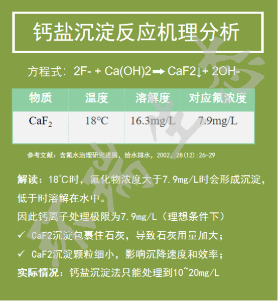 氟化鈣在18 ℃時于水中的溶解度為16.3 mg/L,按氟離子計為7.9 mg/L,在此溶解度的氟化鈣會形成沉淀物。氟的殘留量為10~20 mg/L時形成沉淀物的速度會減慢。當(dāng)水中含有一定數(shù)量的鹽類,如氯化鈉、硫酸鈉、氯化銨時,將會增大氟化鈣的溶解度。因此用石灰處理后的廢水中氟含量一般不會低于20~30 mg/L。