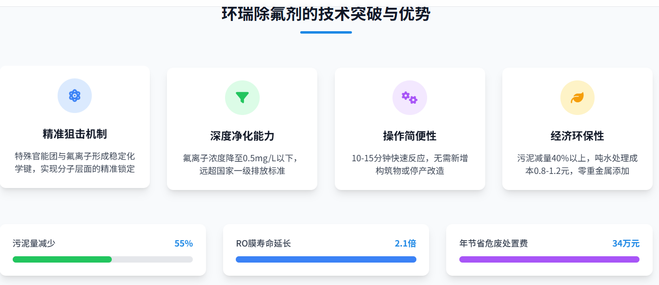 環(huán)瑞除氟劑的藥劑純度>99%,投加量少,污泥減量40%以上,噸水處理成本降低至0.8-1.2元,顯著降低了企業(yè)的運(yùn)維成本。同時(shí),其零重金屬添加、智能降解設(shè)計(jì)、PH自適應(yīng)等特性,使其在環(huán)保安全方面具有顯著優(yōu)勢(shì)。