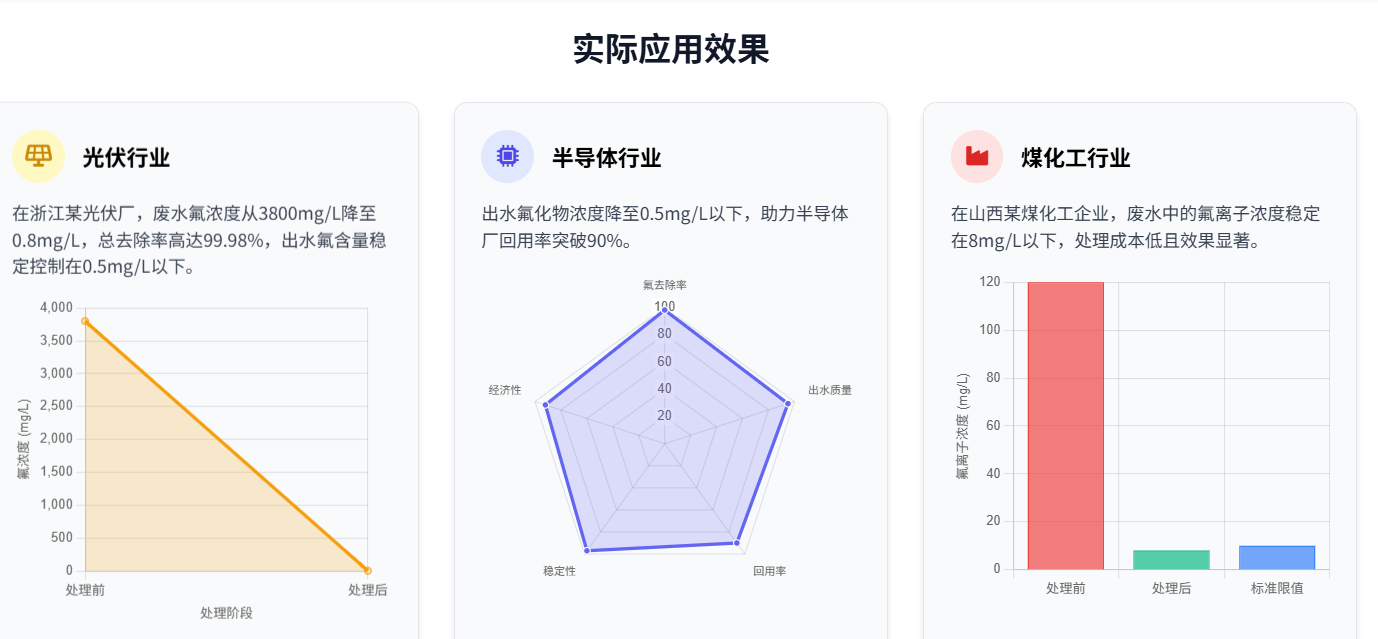 光伏行業(yè):在浙江某光伏廠,廢水氟濃度從3800mg/L降至0.8mg/L,總去除率高達99.98%,出水氟含量穩(wěn)定控制在0.5mg/L以下。