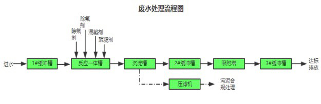 廢水有生產(chǎn)車間經(jīng)泵輸送到1#緩沖槽,達到設定液位后自動開啟進水泵,進入連續(xù)反應一體槽,自動聯(lián)動加藥泵,開始投加山東環(huán)瑞生態(tài)的高效除氟劑除氟劑,經(jīng)充分攪拌一段時間后加入除氟劑F6,在充分攪拌一段時間,分別加入混凝劑、絮凝劑后,進入沉淀槽沉淀,上清液溢流進入2#緩沖槽,達到設定液位后,自動開啟吸附裝置,經(jīng)吸附后,進入3#緩沖槽,出水福含量達到1.5mg/L以下排放。