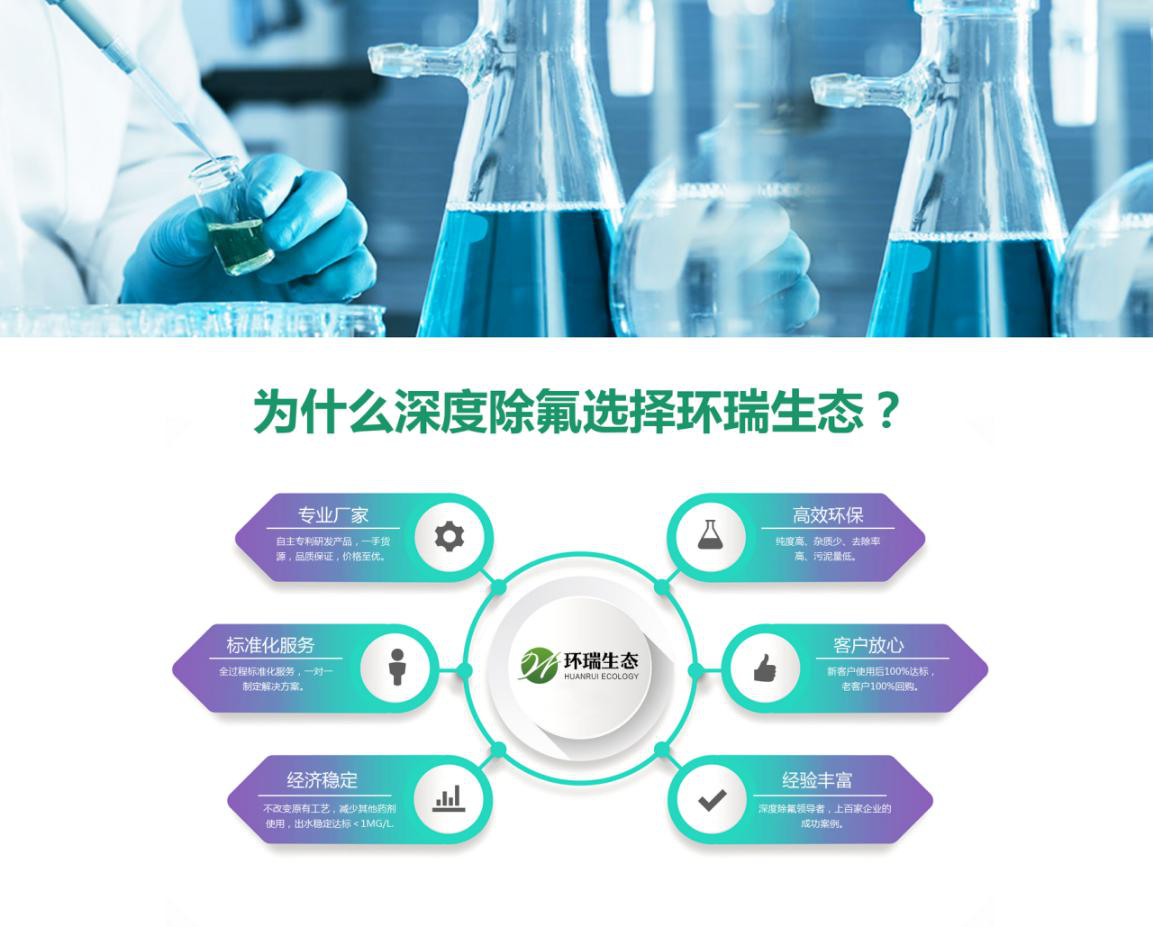 針對現在國家標準的排放規(guī)定,山東環(huán)瑞生態(tài)研制出高效除氟劑,除氟劑反應機理:利用有效組分高正電荷密度、中聚合度等特點,促使其羥基位點快速與廢水中的F-絡合形成穩(wěn)定的配合物;同時因正電荷密度降低,加速配合物聚集沉淀,實現游離態(tài)氟向顆粒態(tài)氟的轉化,再經高分子絮凝劑搭橋、捕捉等作用,快速實現泥水分離,達到廢水除氟目的,可針對不同濃度進行氟的處理。