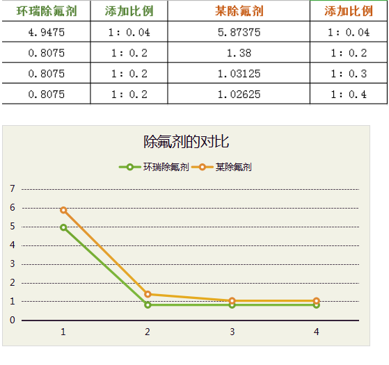 由實(shí)驗(yàn)數(shù)據(jù)可知,環(huán)瑞除氟劑按照同等的比例添加,比市面的除氟劑添加量較多的情況除氟效果好。